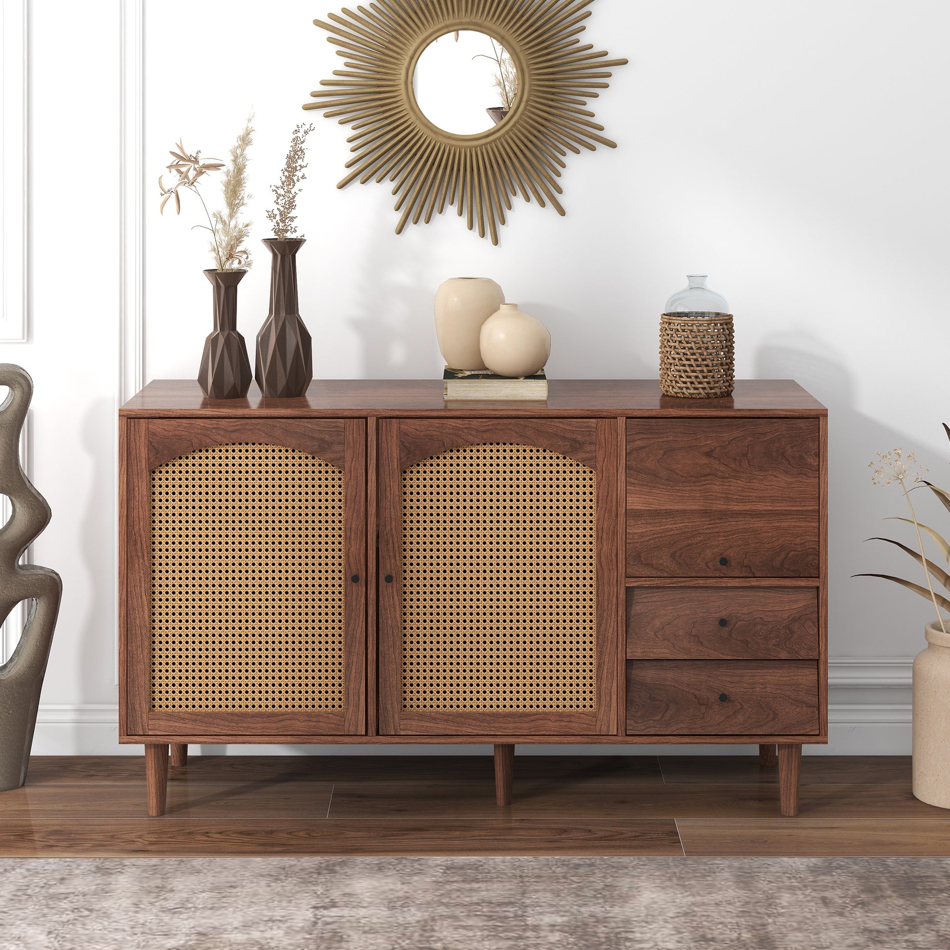 Wide Rattan Insert Sideboard with Three Doors and Two Irregular Drawers