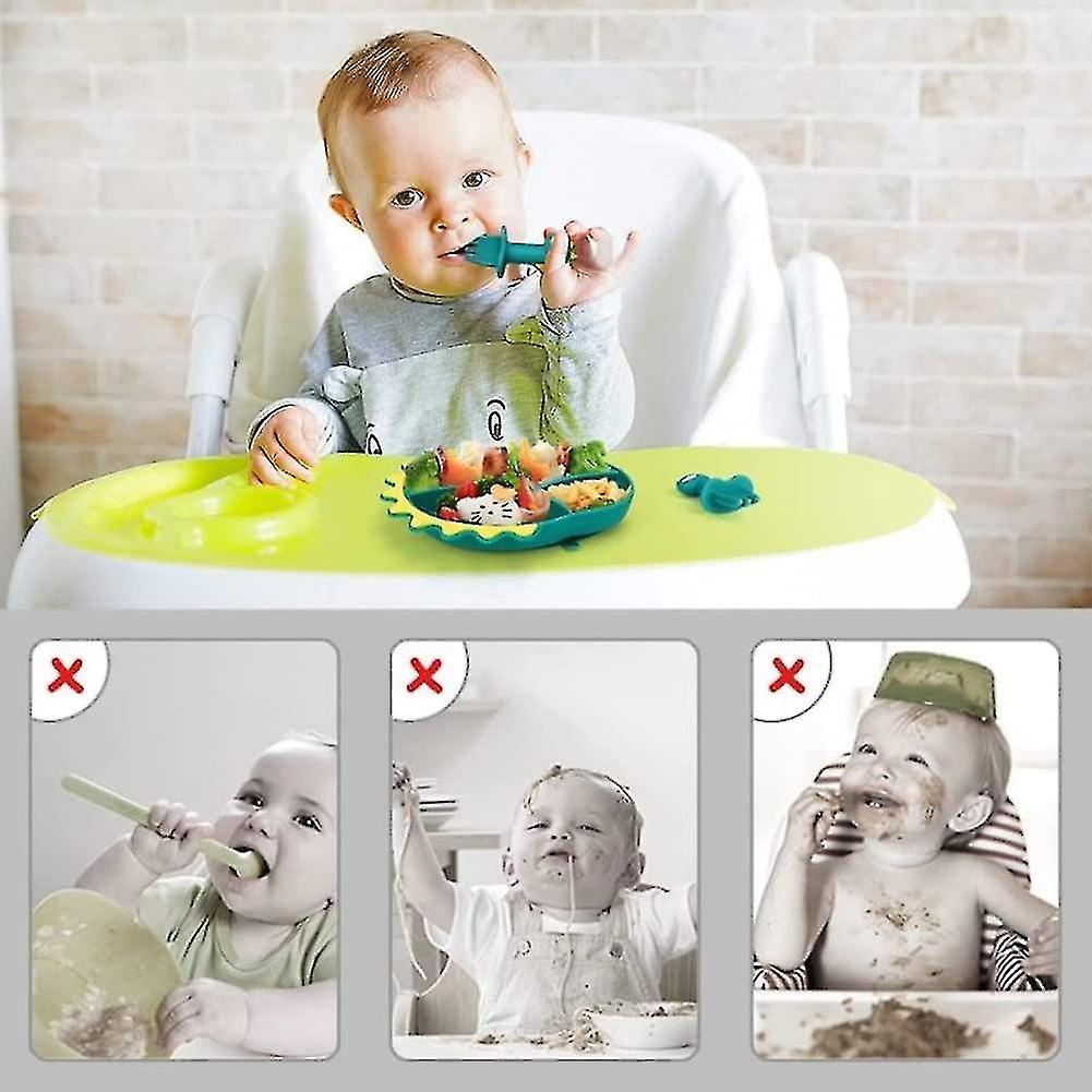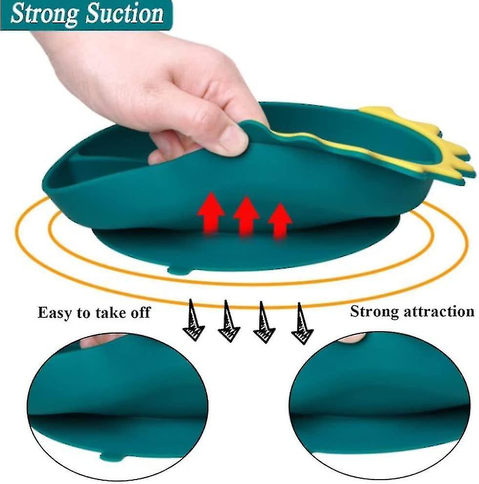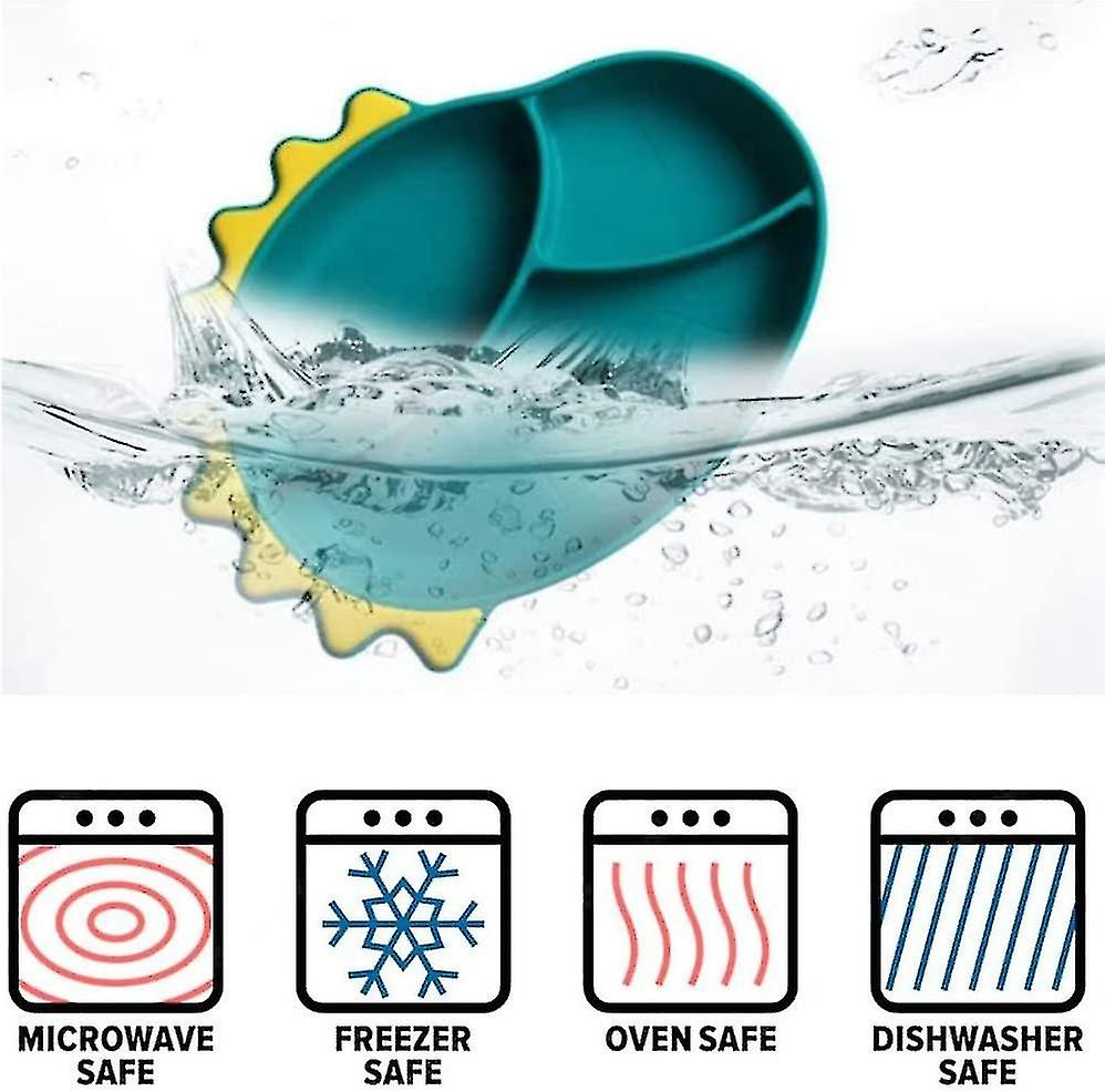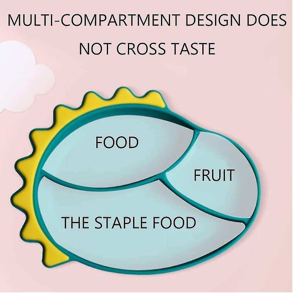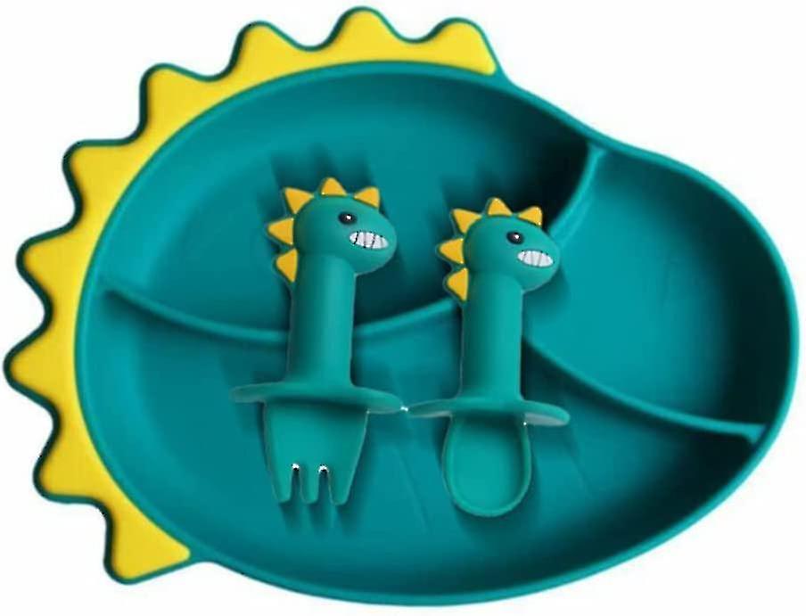 (Y)Baby Feeding Stay Put Bowl Spoon Fork 3 Pcs Set, Cartoon Dinosaur Silicone Divided 3 Section Plate With Non Slip Suction Base,